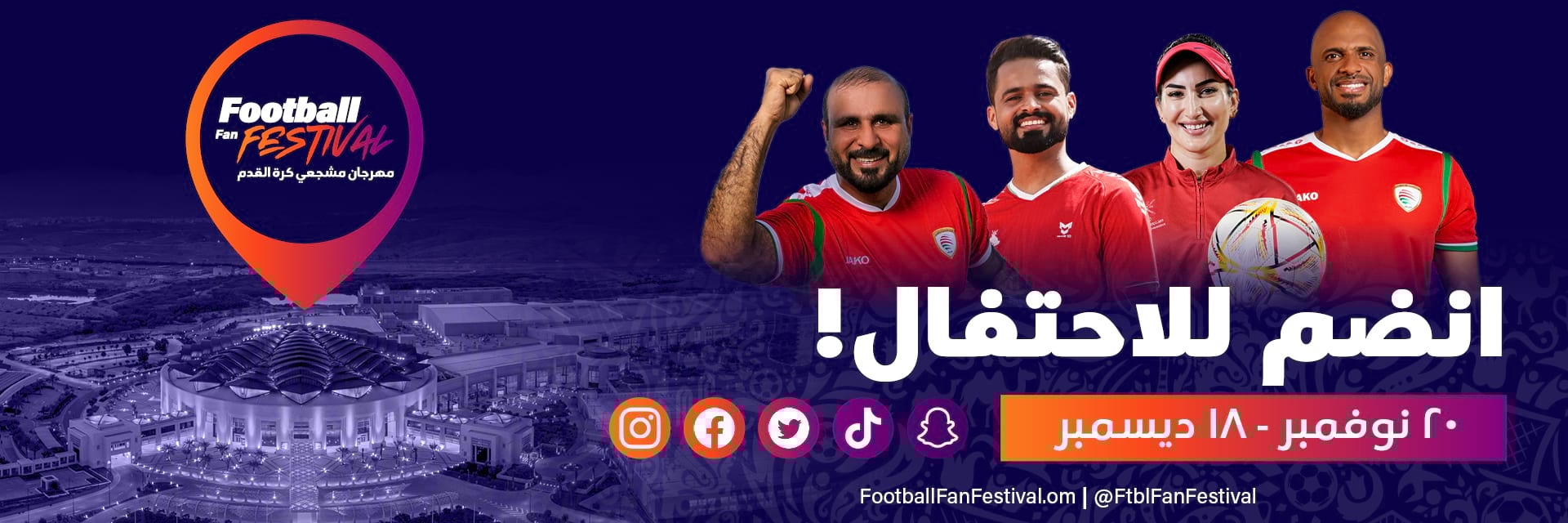 انضم إلى أكبر احتفال لعشاق كرة القدم في سلطنة عمان في مهرجان مشجعي كرة القدم - تتوفر تذاكر الدخول ليوم واحد بسعر 2 ريال عماني فقط للتذكرة. في حين يُسمح للأطفال من عمر 5 سنوات وما دون من الدخول مجاناً.